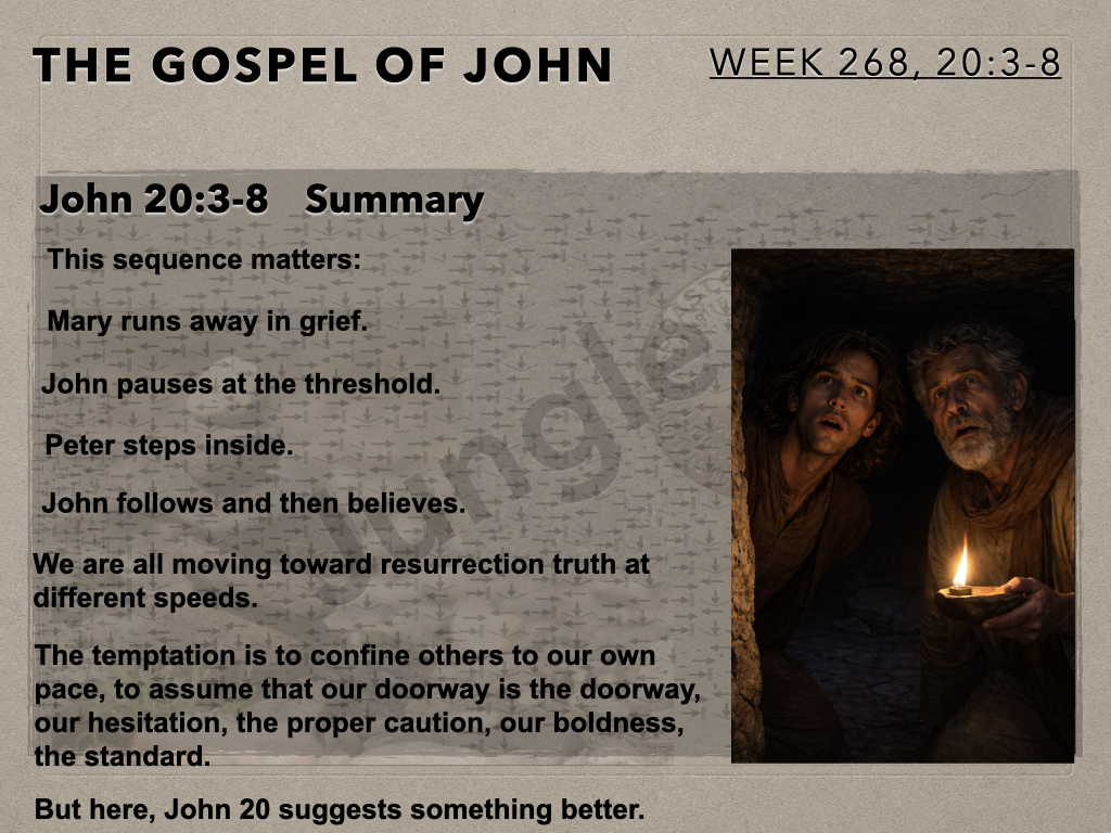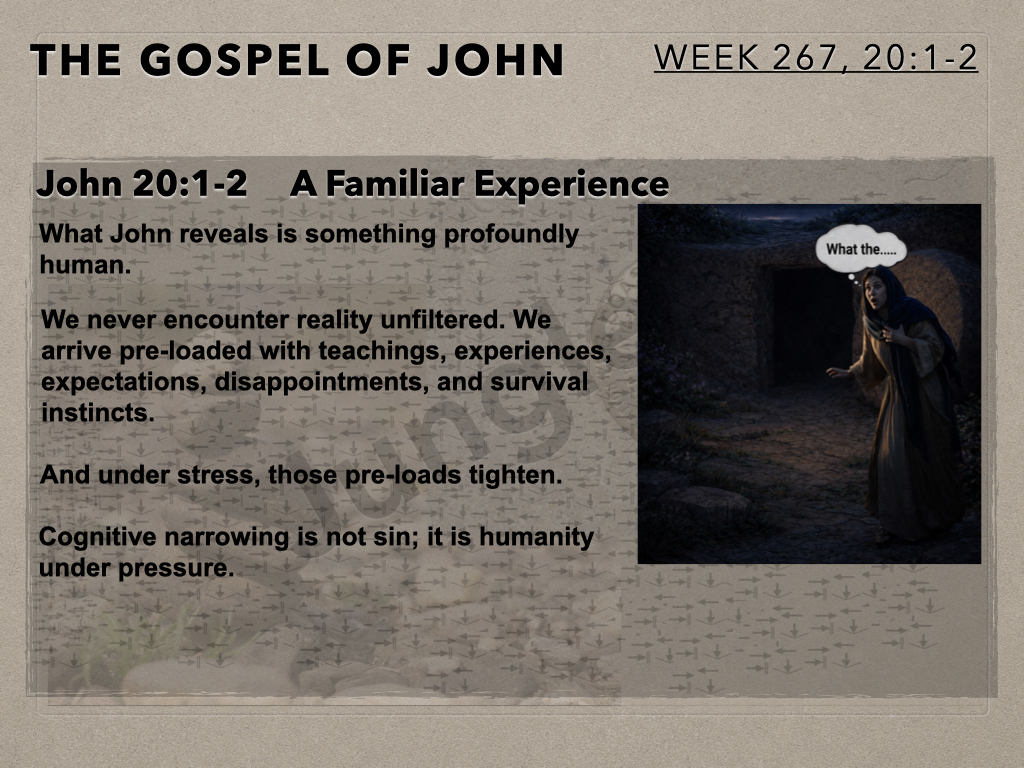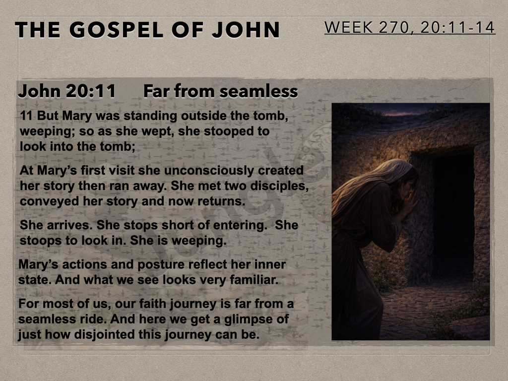 In session 270 the camera swings back to Mary at the tomb for the second time on that Sunday morning. She is in grief and confused. She is interacting with two unknown beings. She is so close to what is true but at this juncture unable to see. Mary’s story is our story.
