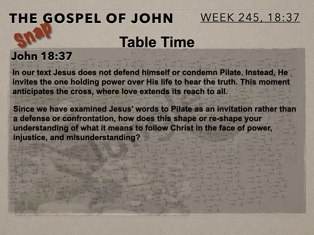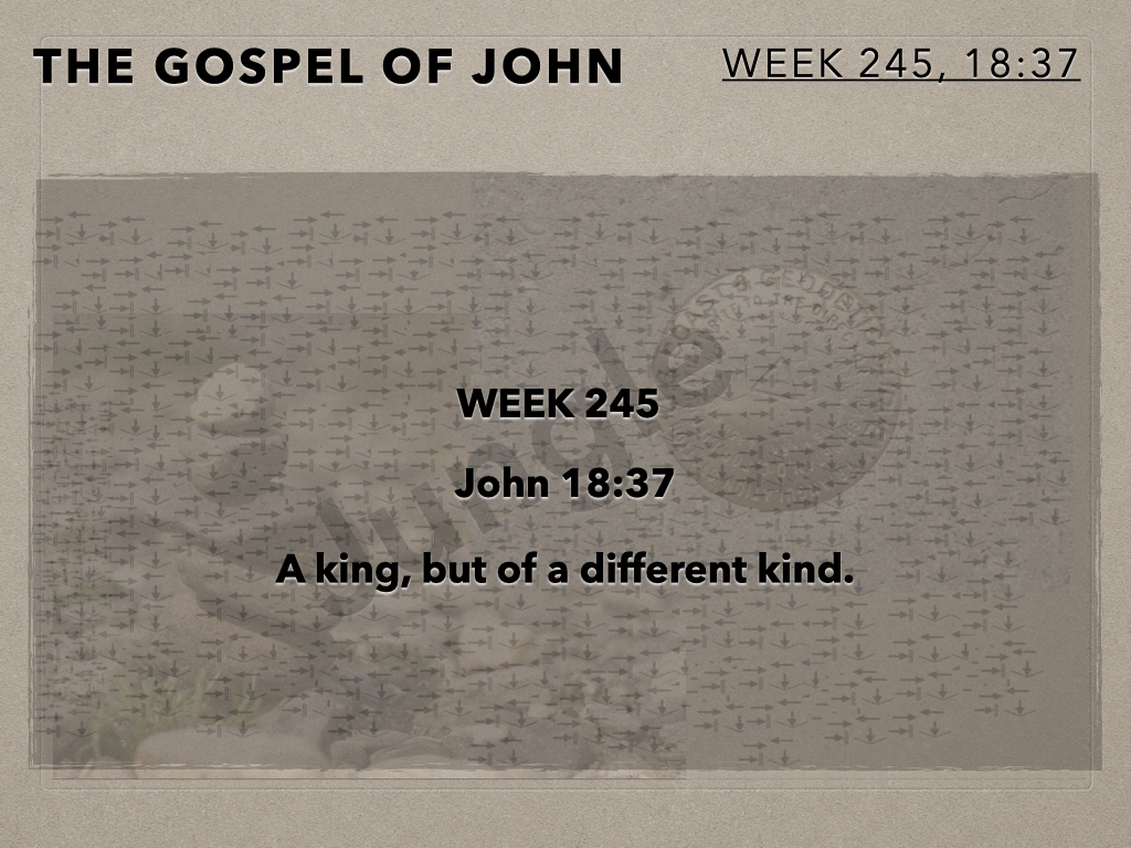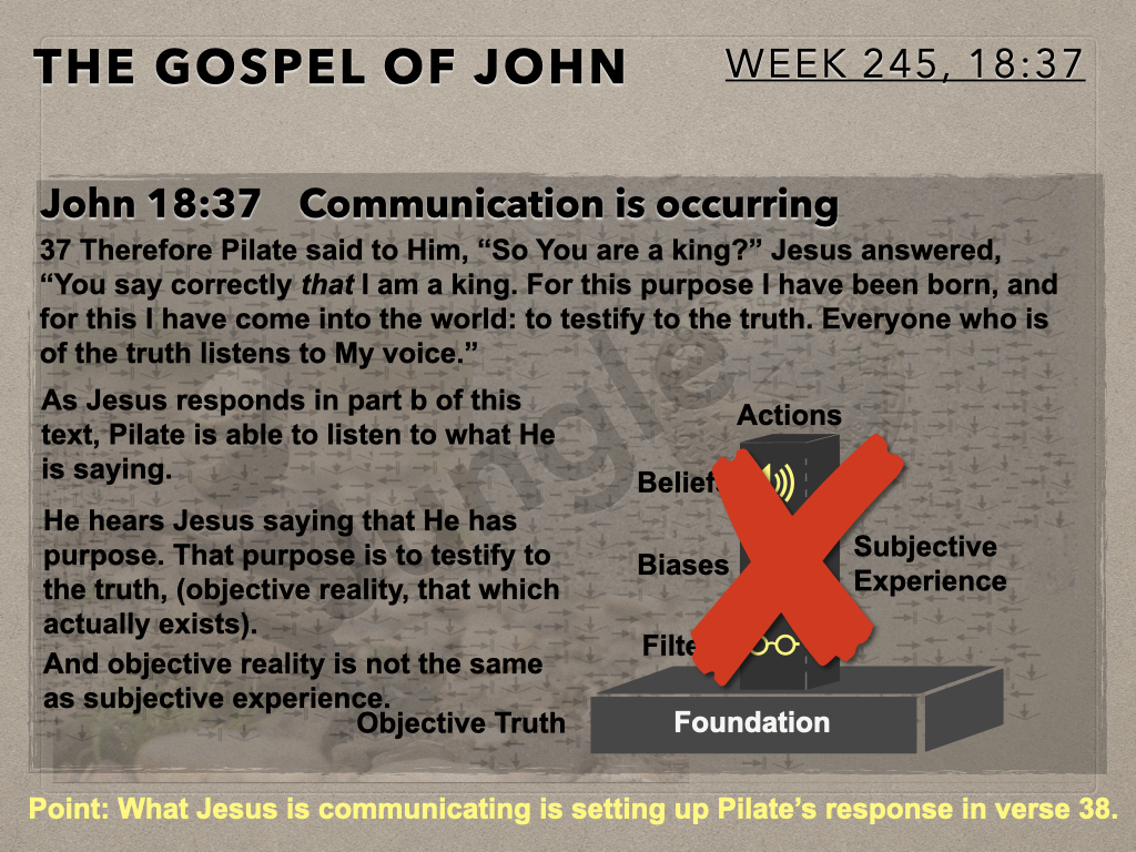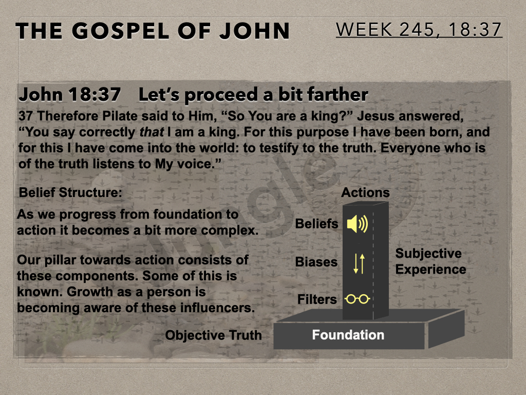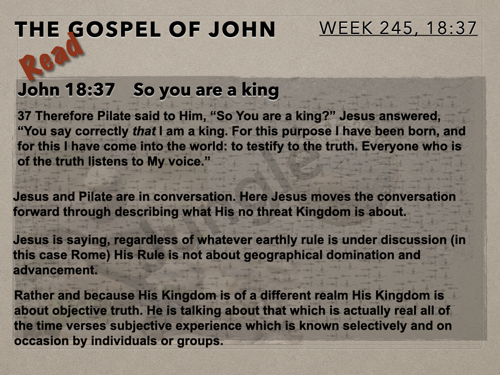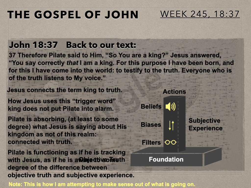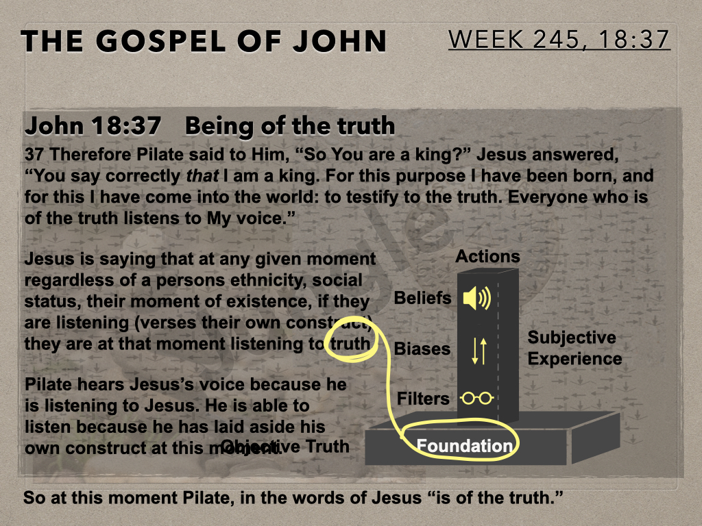 The Gospel Of John (Week 245) John 18:37 In this session we continue with the interaction with Jesus and Pilate. In conversation, Jesus makes the connection of king to truth. Here we provide an explanation of how we may want to consider what is occurring. Thanks for joining us.