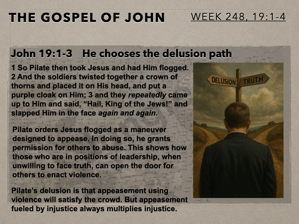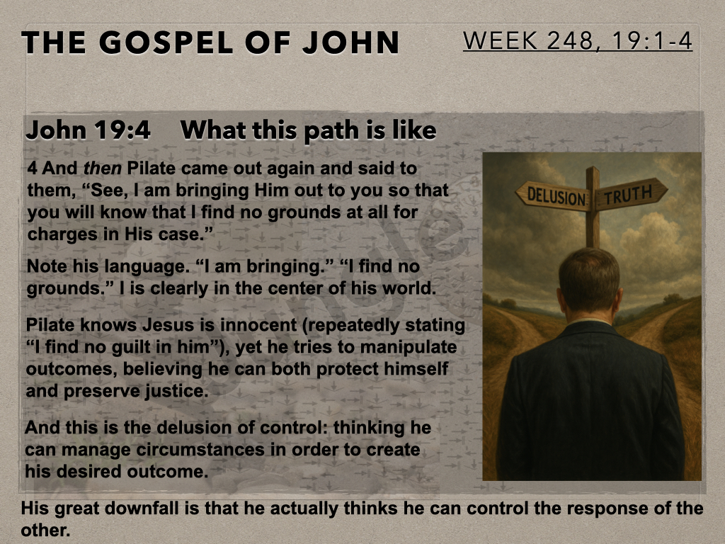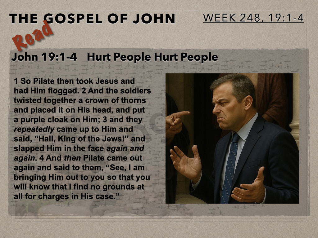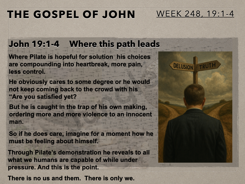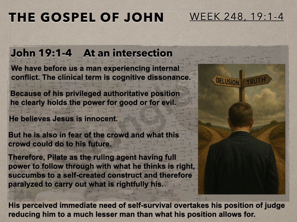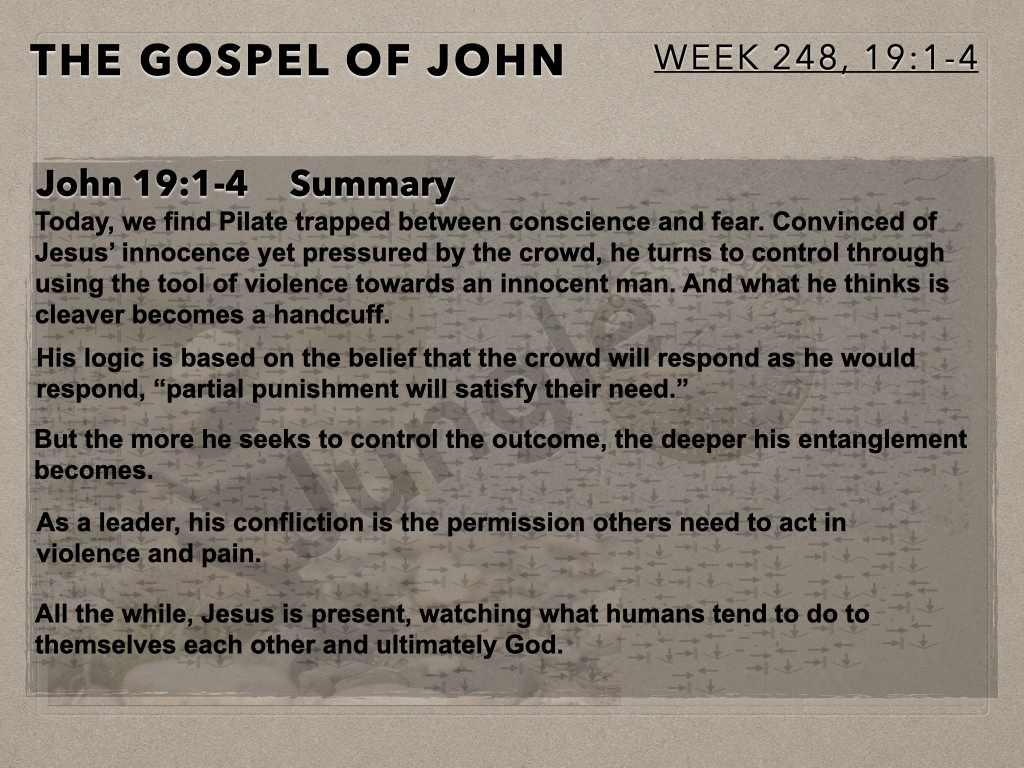 The Moot Men begin chapter 19 of John’s gospel account by continuing to examine Pilate, his dialog with Jesus, his resulting internal conflict and interaction with the crowd. The author provides detail of this interaction which informs how to think about what is about to occur.