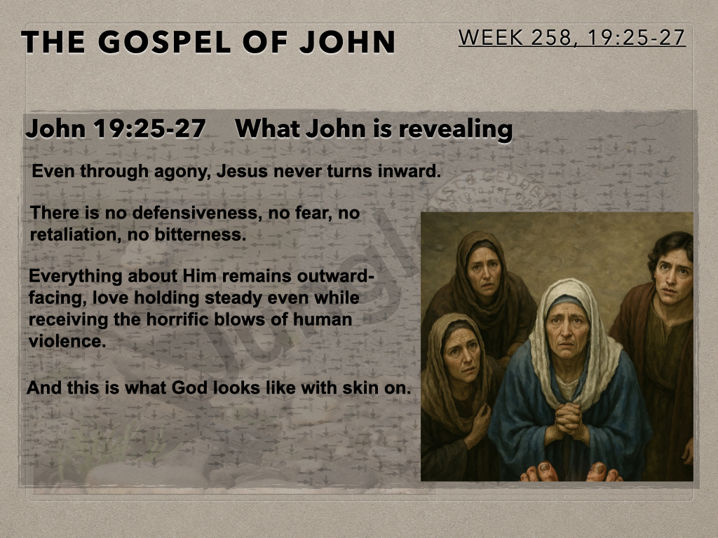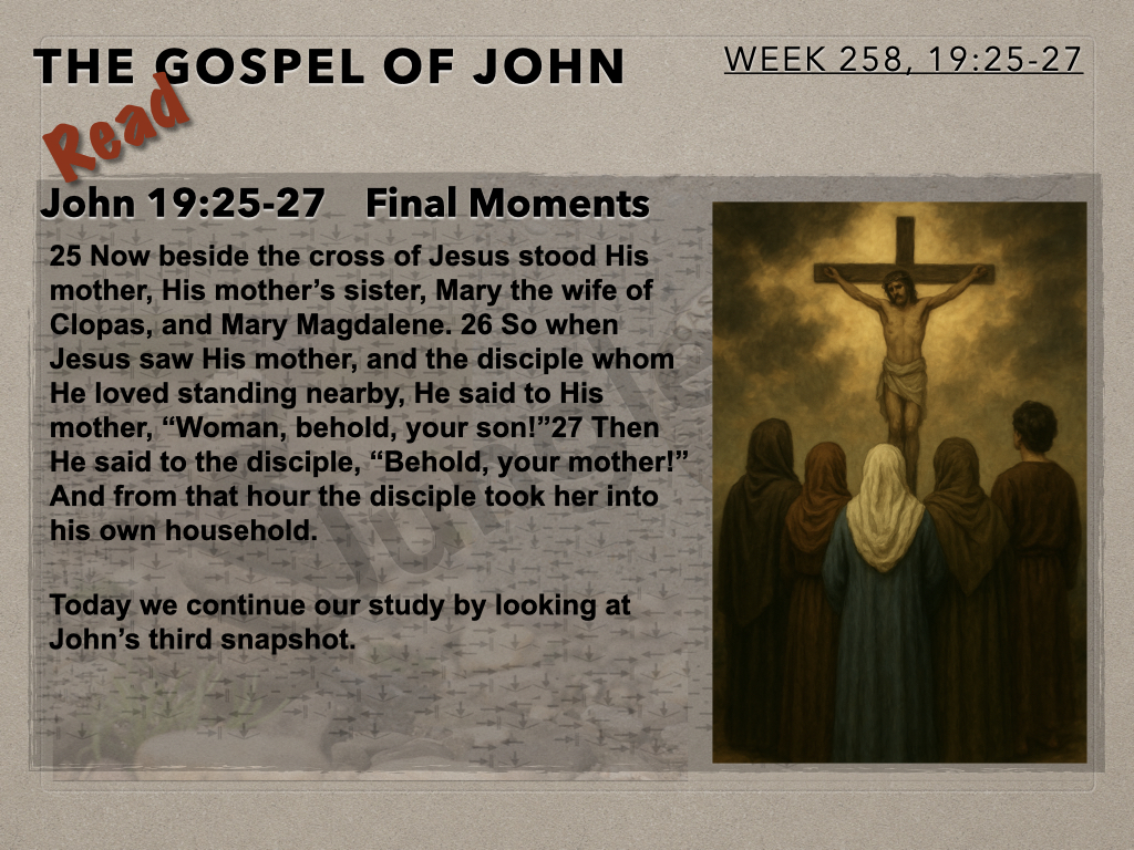 In session 258 the Moot Men take a look at the third image John provides his readers, a small gathering at the foot of the cross. Viewing the cross as revelation we here see the relentless love of God in relation to the connected human community. We see what Jesus called out for His disciple. And we see what Jesus is calling out for all His disciples in any age and at any place.
