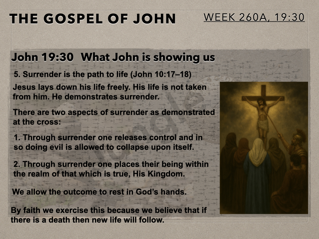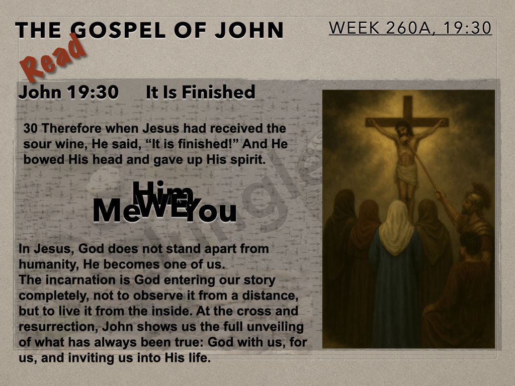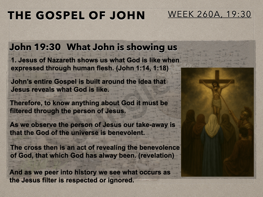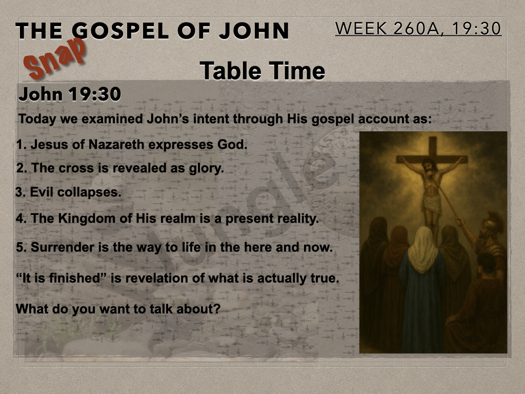 In session 260A the Moot Men arrive at “It is finished.” This phrase has been thought about, examined, spoken, discussed and debated throughout church history, possibly as much or more than any of His spoken words. This morning we look at John 19:30, from the first of two perceptions, what did the writer want us, his audience, to understand about the cross? Thanks for joining us.