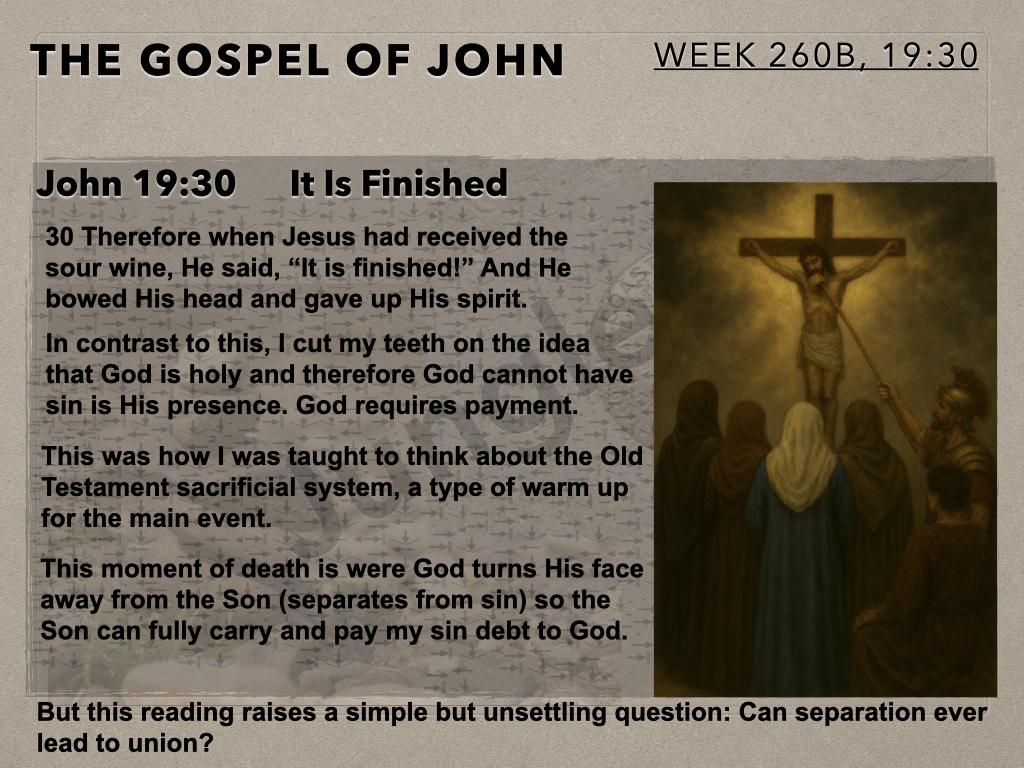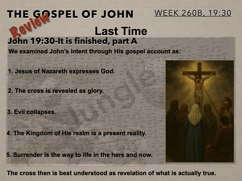 In session 260B the Moot Men take a second look at “It is finished.” In our last session we examined this phrase through the lens of John’s intent expressed throughout his gospel account. In this session we see how this phrase is best understood in relation to the New Testament’s stated outcome for humanity. To be in Christ and Christ to be in us is the monumental reality. Therefore, “it is finished” is to be seen from this perspective.