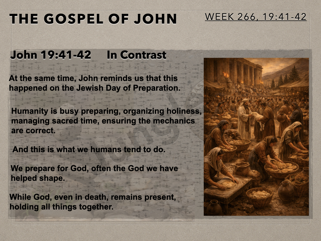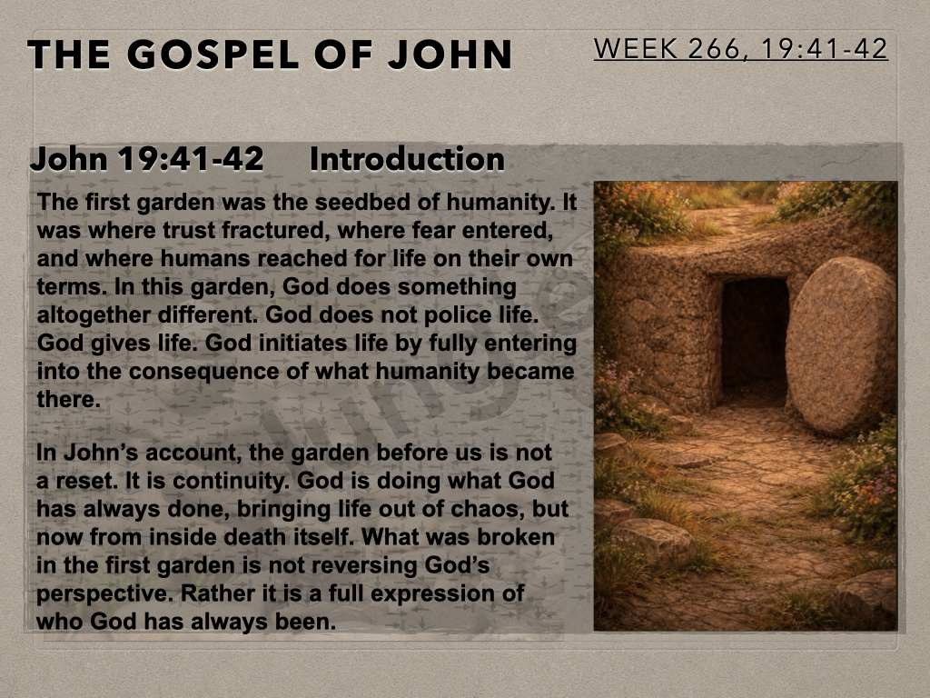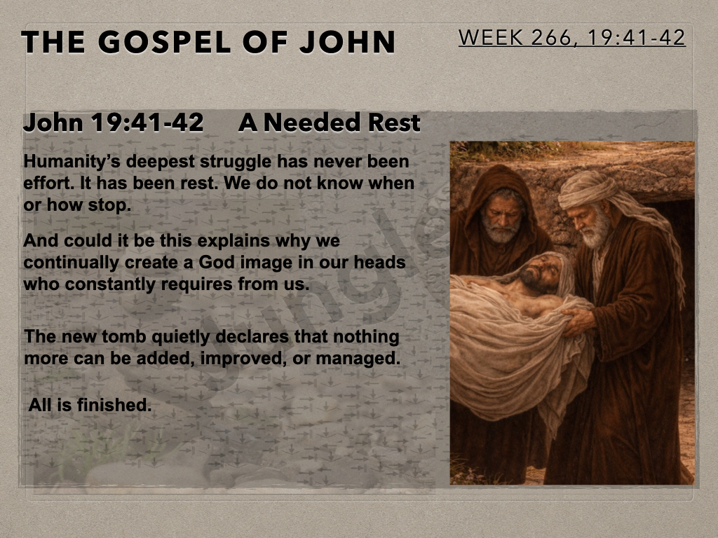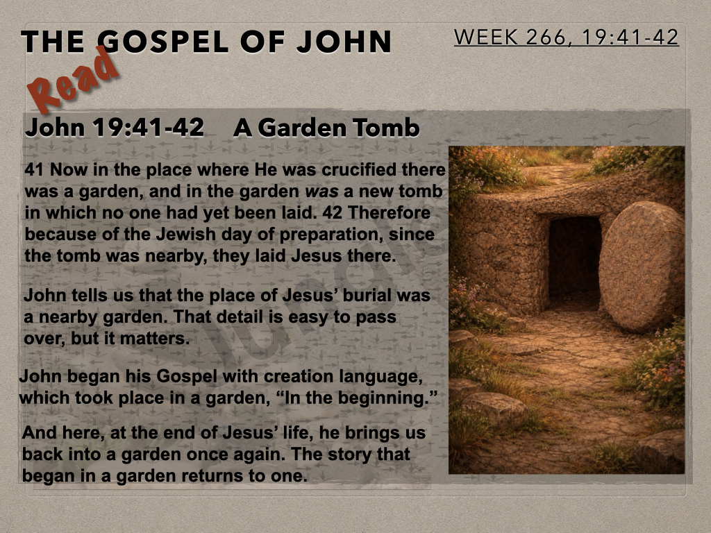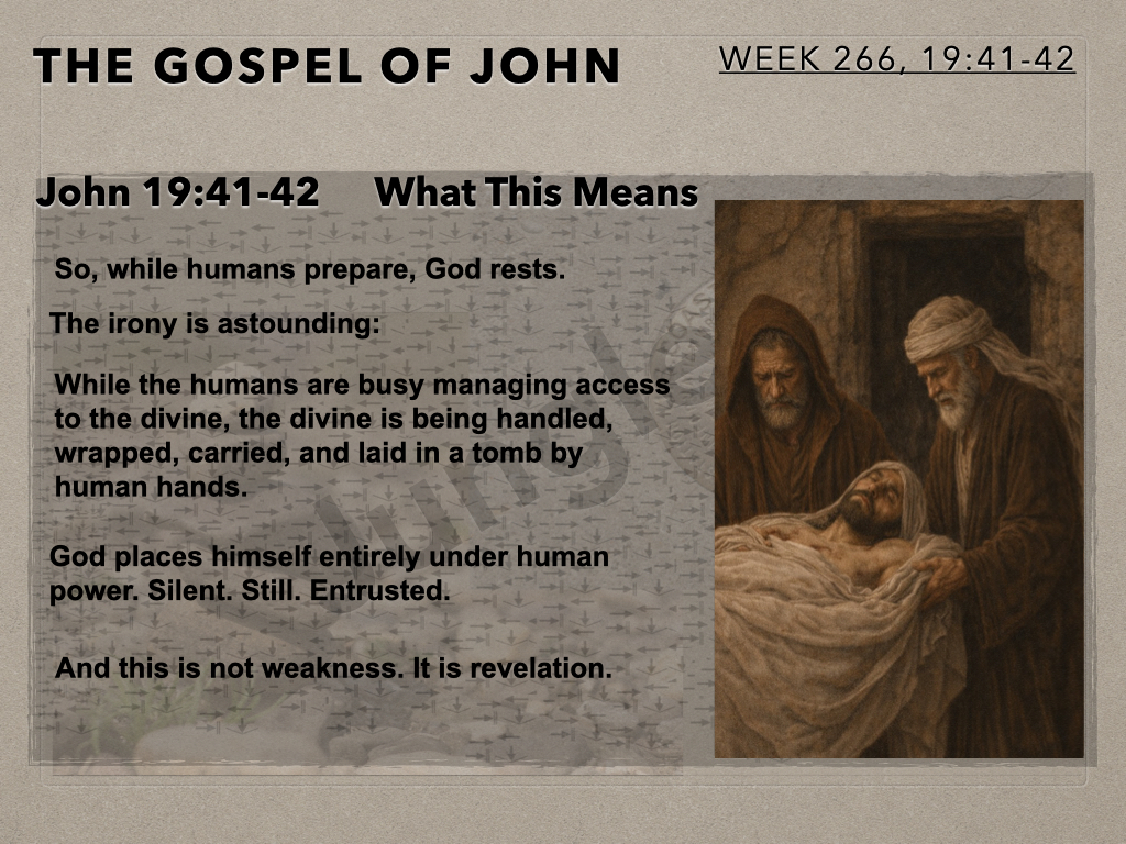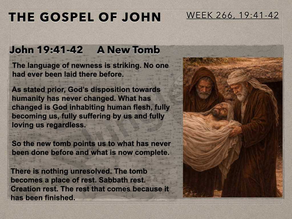 In Session 266 the Moot Men arrive at the end of chapter 19 of John’s Gospel account. We have before us, a sealed tomb on one hand and a busy preparation to enter sacred space on the other. Viewing what has occurred through the lens of revelation brings us to an appropriate place to pause before Sunday morning occurs.