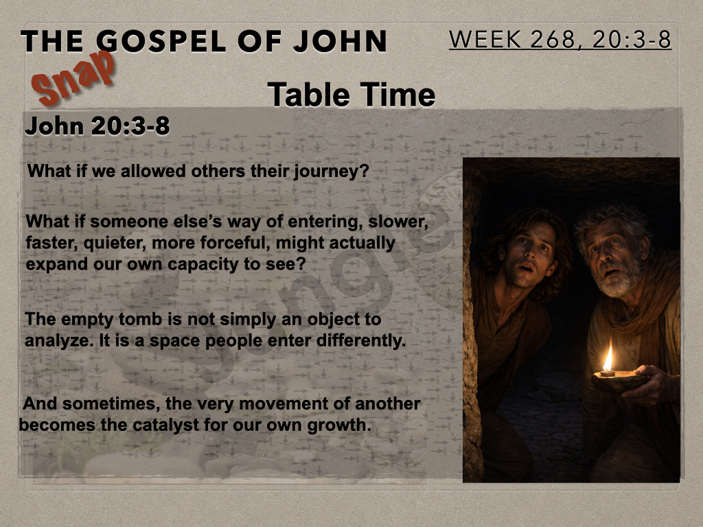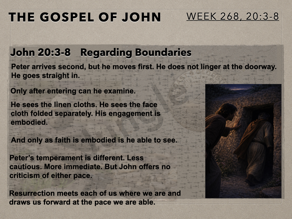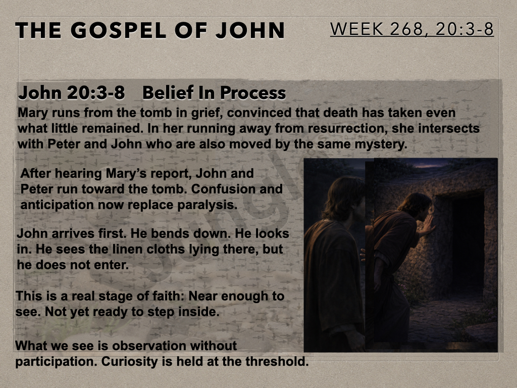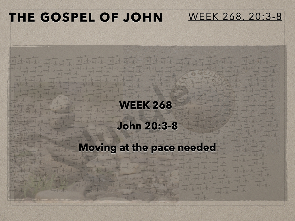 The Gospel Of John (Week 268) John 20:3-8 In Session 268 the Moot Men continue their look at resurrection morning. Last time we looked at Mary arriving first at the empty tomb. After a short exchange with Mary, Peter and John rush to the tomb. And this is where we pick up our story.