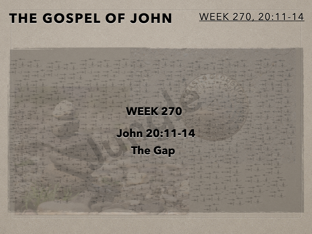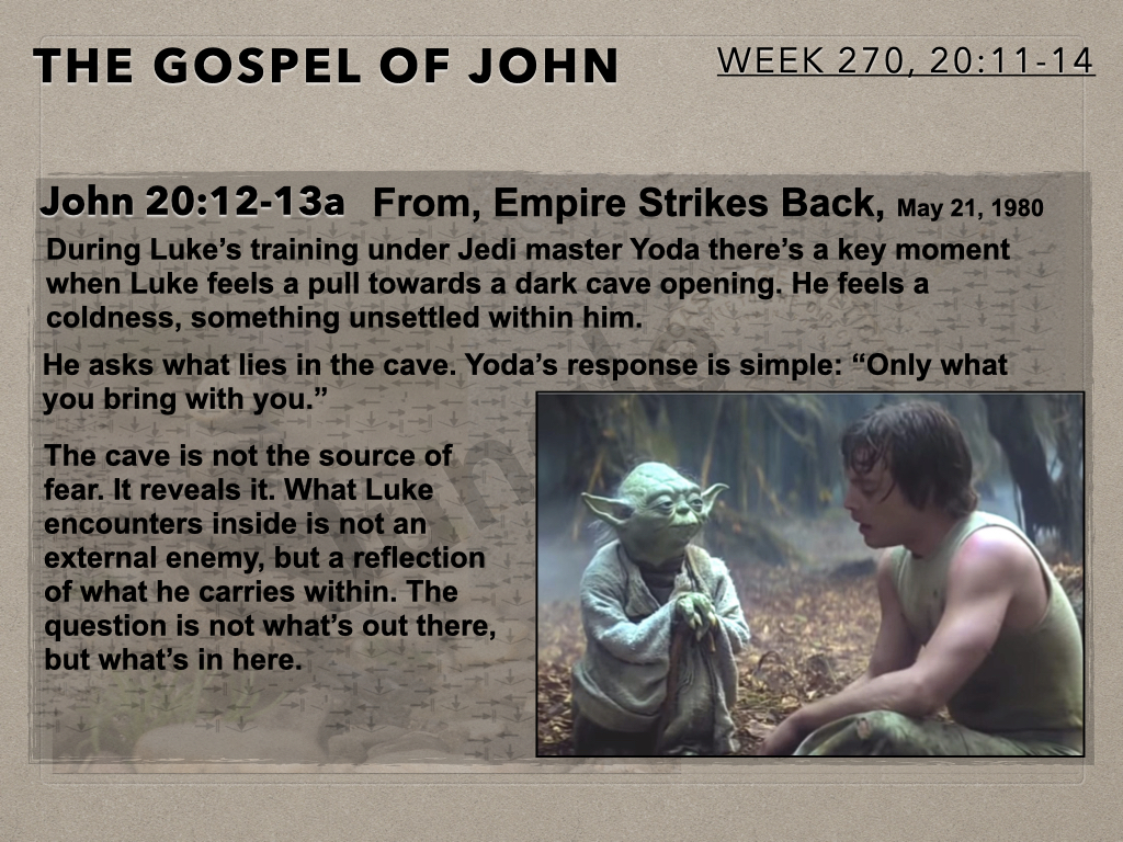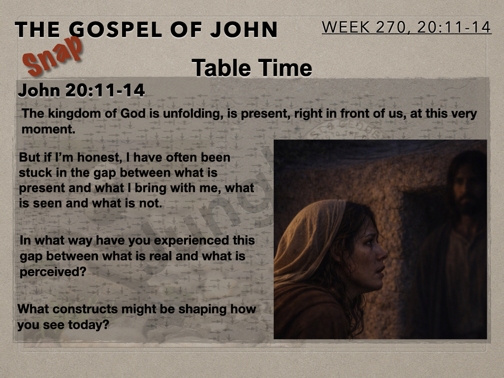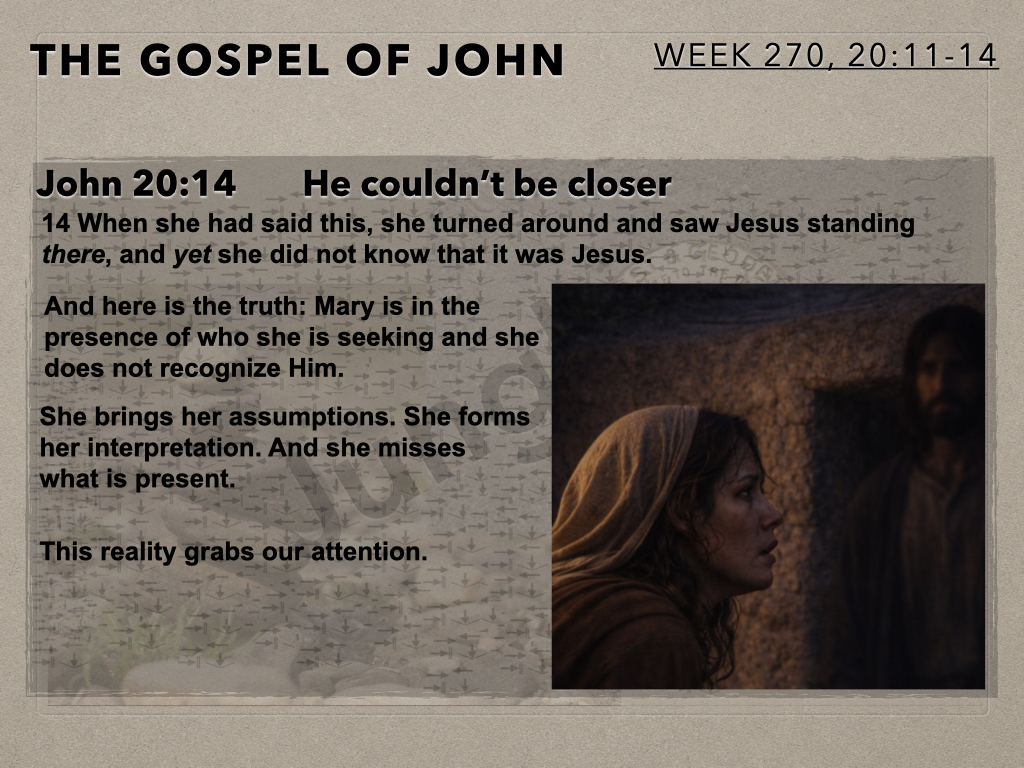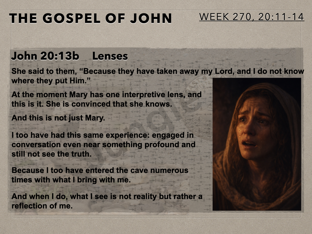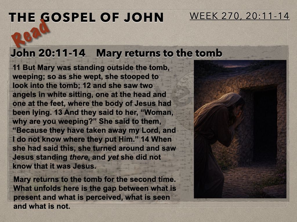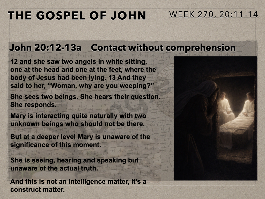 In session 270 the camera swings back to Mary at the tomb for the second time on that Sunday morning. She is in grief and confused. She is interacting with two unknown beings. She is so close to what is true but at this juncture unable to see. Mary’s story is our story.